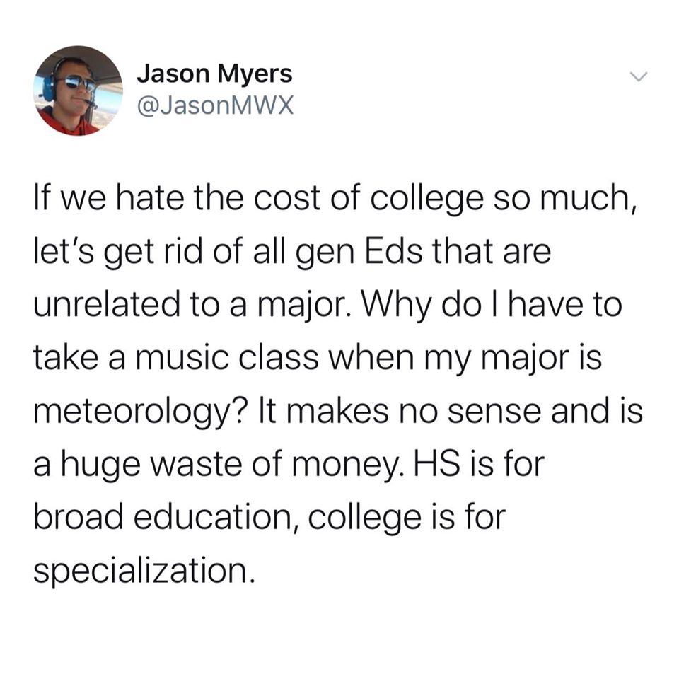 Third, this position misunderstands how college degrees work. A bachelor’s degree from an accredited institution will require roughly 120 credit hours, whether all of those hours are in one’s major or spread throughout the university. Only taking courses in one’s major won’t suddenly make a four-year degree obtainable in two years. One way to cut down on costs is to spend two years taking courses at a two-year institution or community college, but those courses will likely be in general education and liberal arts. One way or another, those with bachelor’s degrees must complete 120 hours of classes—and taking only classes within their major won’t decrease the time or financial commitment they have to make.