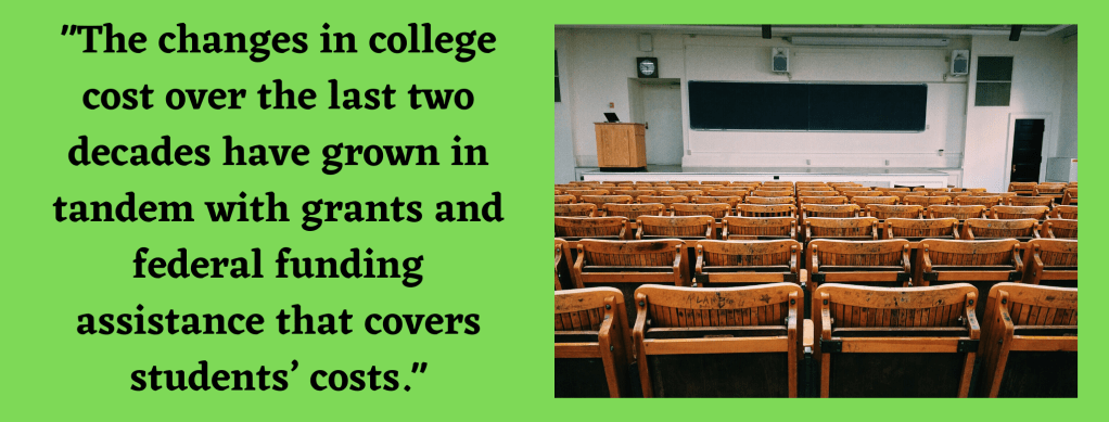 But this argument misses three important points. First, the sticker price of tuition has certainly increased over the last few decades, most notably in the lead-up to the economic downturn of the late 2000s. It is important to note that tuition is not the primary driver of these inflated prices. Each year, College Board publishes a study on cost trends in higher education, and the data have consistently shown that tuition and associated fees do not drive rising college costs. Even room and board, once an afterthought to college costs and now the second-highest expense for most students, has stayed more or less stagnant when compared to inflation. Instead, the changes in college cost over the last two decades have grown in tandem with grants and federal funding assistance that covers students’ costs. While schools have gotten more expensive, the federal government has defrayed many of these costs for students, resulting in a manageable increase of roughly $100 per year. According to College Board’s report, the average net price for tuition, fees, and room and board at private four-year schools (usually the most expensive institutions) “increased from about $13,400 (in 2019 dollars) in 2011-12 to an estimated $14,400 in 2019-20; this net price remains below its level from 2001-02 through 2008-09.”2 The cost of college remains high and inaccessible for many people, but the rate at which costs are increasing has been grossly exaggerated and misunderstood.